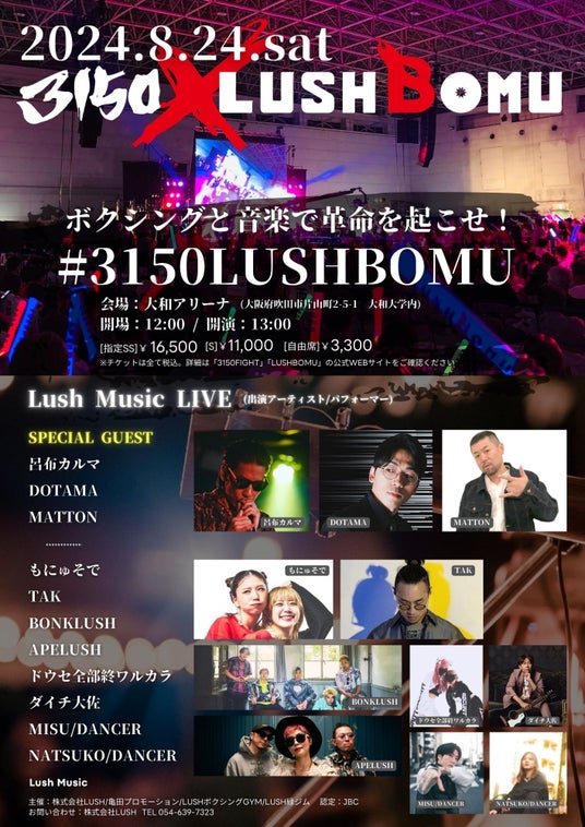 vol.1(8月24日:大阪)を皮切りに、vol.2(10月12日:愛知)、vol.3(12月21日:静岡)と、2024年下半期、3150×LUSHBOMUがボクシング界に大きなうねりを起こす存在となります。