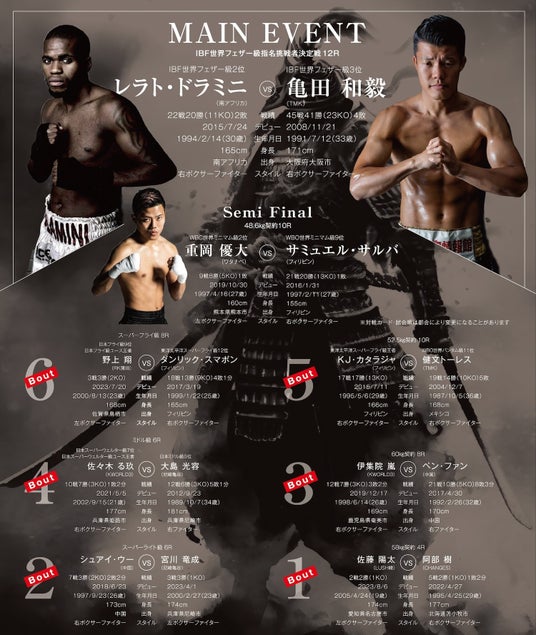 メインイベントはIBF世界フェザー級指名挑戦者決定戦。レラト・ドラミニ(同級2位:南アフリカ)と亀田和毅(同級3位:TMK)が対戦。