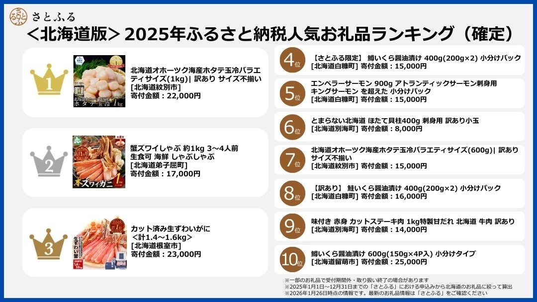 ふるさと納税ポータルサイト「さとふる」を運営する株式会社さとふる(本社:東京都中央区、代表取締役社長 兼 CEO:藤井 宏明)は、「さとふる」における<北海道版>2025年人気お礼品ランキング(確定)(※1)を発表します。