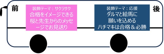 バス後部はダルマと絵馬に願いを込めてハチマキでがんばる受験生を応援。降車時にはバス前部に表現した桜の花道や先生からのメッセージで合格に向かえるよう受験生を後押し