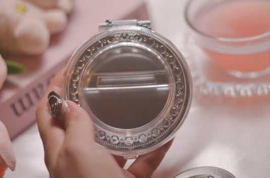 ミラーの大きさは手のひらサイズの約80mm。ガラスミラーを採用しているからクリアな反射で見やすい!メイク直しや髪型のセット直しもスムーズにできます。推し活現場で役立つこと間違いなし◎