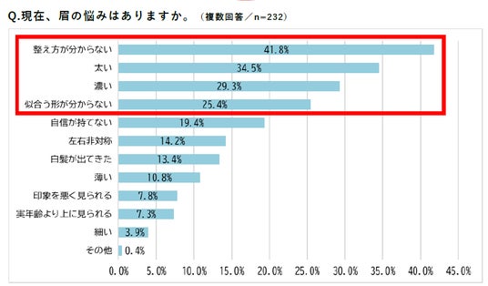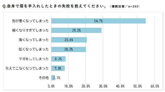 次いで、「細くなりすぎてしまった」(29.2%)、「薄くなってしまった」(20.6%)、「短くなってしまった」(20.2%)が続き、細かさや慎重さが必要とされる眉の手入れを難しいと感じている方が多い様子がうかがえます。