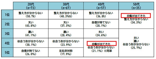 世代別に見ると、40代からは「白髪が出てきた」が上位にランクインし、50代では眉毛の白髪が最も多い悩みとなりました。