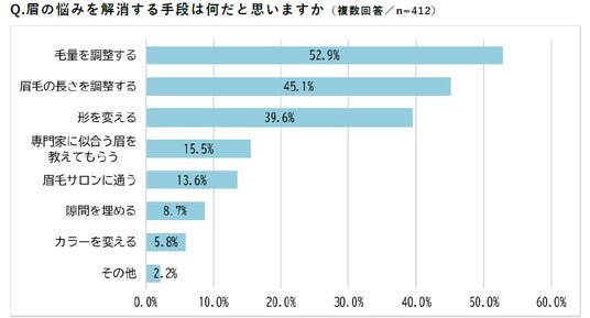 眉の悩みを解消する手段を尋ねたところ、半数以上が「毛量を調整する」と回答しました。眉が濃い場合は薄く、薄い場合はボリュームを出すなど、毛量を調整することで理想の眉に近づくと考えていることが分かります。