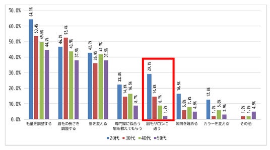 年代別に見ると、20代の約3人に1人が眉の悩みを解消する手段として「眉毛サロンに通う」と回答しており、昨今の男性の美容意識の高まりから、若年層の男性には眉毛サロンも一般的になってきているのかもしれません。