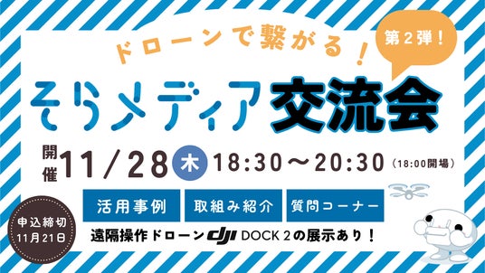 中京テレビ放送株式会社(本社:名古屋市中村区 代表取締役社長:伊豫田 祐司)のドローンスクール「そらメディア」は、11月28日(木)にドローンで繋がる交流会の第2弾を開催することをお知らせいたします。