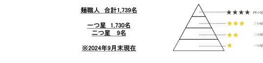 全店で店内製麺を行っている丸亀製麺では、製麺技術を画一的なマニュアルではなく、各々の判断を伴う職人技として教えています。さらに、技術力向上と教育システムの一環として、2016年より取り入れているのが麺職人制度です。技術や経験によって、一つ星から四つ星まで、4つに分類しています。