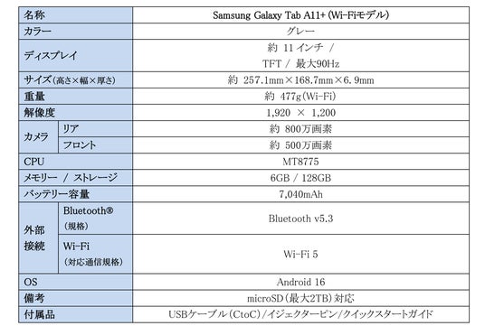 <主な仕様:「Samsung Galaxy Tab A11+ (Wi-Fiモデル)」>