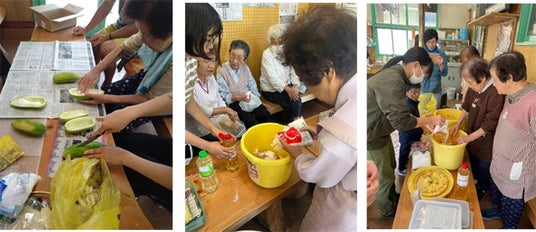 (伝統料理「あばさん漬け」(シロウリの酒かす漬け)ワークショップの様子。元は宇津の特産品だったが自然消滅し、今回数十年ぶりに復活した。左:塩漬け作業 / 中:粕漬け作業 / 右:漬かり具合の確認)