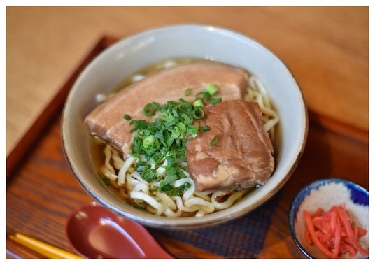 地元今帰仁村の黒糖や泡盛を使用し、長時間かけてじっくり煮込んだトロトロの三枚肉やソーキ、カツオと昆布のしっかりとしたコクのあるスープは化学調味料不使用。