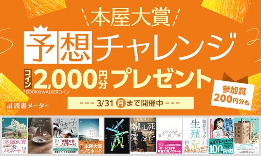 株式会社ブックウォーカー(本社:東京都千代田区 代表取締役社長:森田岳)は、同社が運営する国内最大級の本のレビュー投稿サイト「読書メーター」にて、ユーザー投票による「本屋大賞2025 予想チャレンジ」企画を3月10日(月)から開催します。