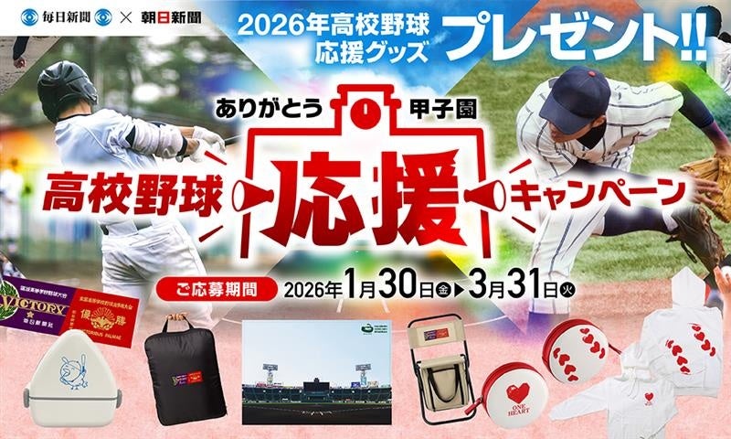 毎日新聞社(代表取締役社長:松木健)と朝日新聞社(代表取締役社長:角田克)は、第98回選抜高等学校野球大会(毎日新聞社・日本高等学校野球連盟主催、朝日新聞社後援、阪神甲子園球場特別協力、3月19日開幕予定)を盛り上げるため、「高校野球応援キャンペーン」を実施します(応募締め切り3月31日)。