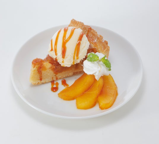 ▪アップルタルト~バニラアイス添え~ ¥590(¥649税込)ダイスりんごが入ったほんのり温かいアップルタルトにバニラアイスを添えカラメルソースをかけました。