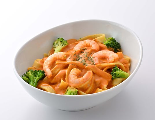 濃厚でクリーミーなビスク風ソースと、ブロッコリー、ぷりぷりの海老を合わせた「えびの濃厚トマトクリームパスタ~ビスク仕立て~」も販売中。完熟トマトの旨味と海老の香りが合わさり、深いコクと豊かな風味が口いっぱいに広がります。プラス110円(税込)で糖質50%オフ、約120キロカロリー減、食物繊維10倍※の低糖質麺への変更も可能。モチモチ食感のフィットチーネ麺のため低糖質にも関わらず、濃厚なソースと絡み上品で贅沢な味わいになります。