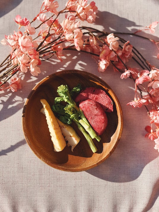 ・桜花塩漬けの鶏もも肉(100g)+春野菜のグリル(たけのこ、菜の花、紅芯大根:1人前)