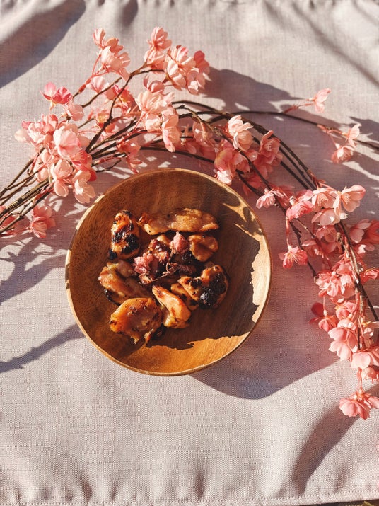 桜花塩漬けの鶏もも肉:桜花で下味をつけた鶏もも肉は、香ばしさとほんのり広がる桜風味が特徴。
