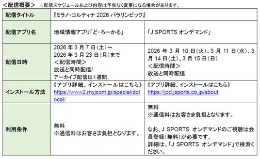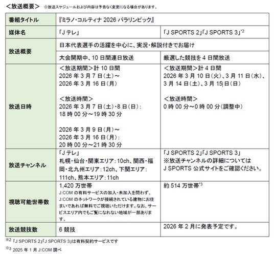 JCOM株式会社(J:COM、本社:東京都千代田区、代表取締役社長:岩木 陽一)と株式会社ジェイ・スポーツ(J SPORTS、本社:東京都江東区、代表取締役社長:長谷 一郎)は2026年3月6日(金)から3月15日(日)に開催される「ミラノ・コルティナ2026パラリンピック冬季競技大会」を放送・同時配信します。J:COMでは、「J:COMテレビ」(「Jテレ」)と地域情報アプリ「ど・ろーかる」、J SPORTSでは、「J SPORTS 2」「J SPORTS 3」*2と、動画配信サービス「J SPORTS オンデマンド」にてご視聴いただけます。なお、J SPORTSでのパラリンピック放送・配信は初の取り組みとなります。