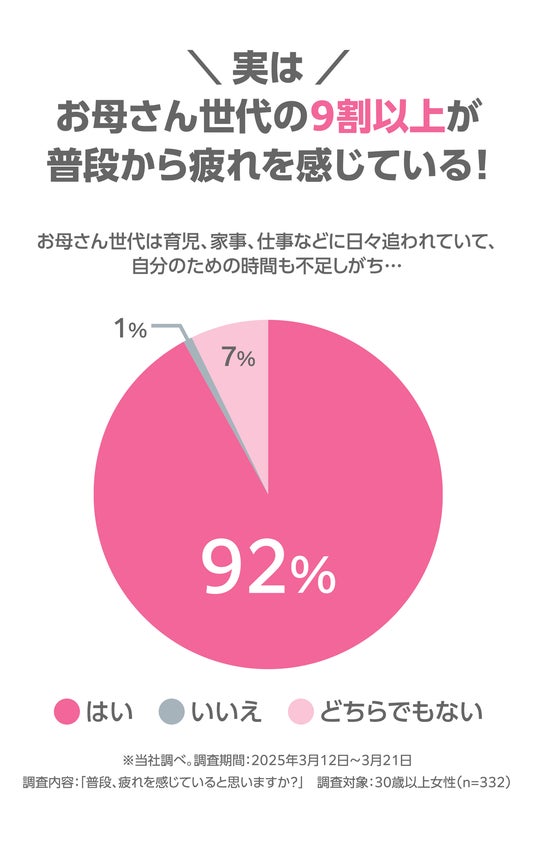 ドクターエアでは、2025年3月12日~3月21日間に16歳以上の男女687名を対象に《健康に関する意識調査》を実施。その結果、約9割以上の方が「普段から疲れを感じている」と回答。また、30歳以上の女性においても同様の結果だった。 また、30歳以上の女性を対象とした「健康に関する悩みは?」という質問においては、『体のコリや痛み』に悩んでいるという回答が多く、さらに一番疲れを感じる部位としては《首・肩》が男性と比較してもダントツの「1位」という結果に。このことから、スマートフォンやPCの長時間使用による影響はもちろん、日々の買い物などの重い荷物の持ち運び頻度の高さなどで首・肩周りに負担を感じている人が多いことがうかがえる結果に。 疲れの対策としては、セルフマッサージをする・ストレッチを行う・湯船に浸かるなど、“自宅でできるケア“を行う人が多く、忙しいお母さん世代と隙間時間に手軽で継続しやすいケアツールの相性の良さから、母の日のギフトにウェルネスツールはオススメです。