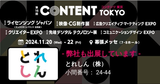 とれしん株式会社(本社:神奈川県横浜市、代表取締役社長:平松猛男)は、2024年11月20日(水)~22日(金)に幕張メッセで開催される「コンテンツ東京」に出展します。
