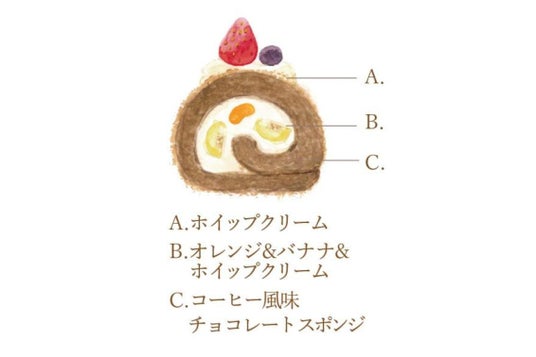 したスポンジに、オレンジ、バナナ、ホイップクリームをのせて巻いたロールケーキです。