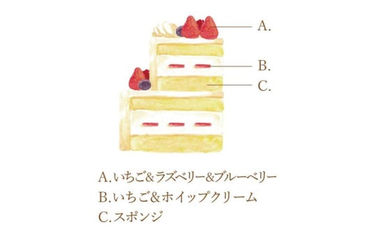 い甘さのホイップクリームをふんわりとしたスポンジでサンドし、仕上げに苺、ブルーベリ