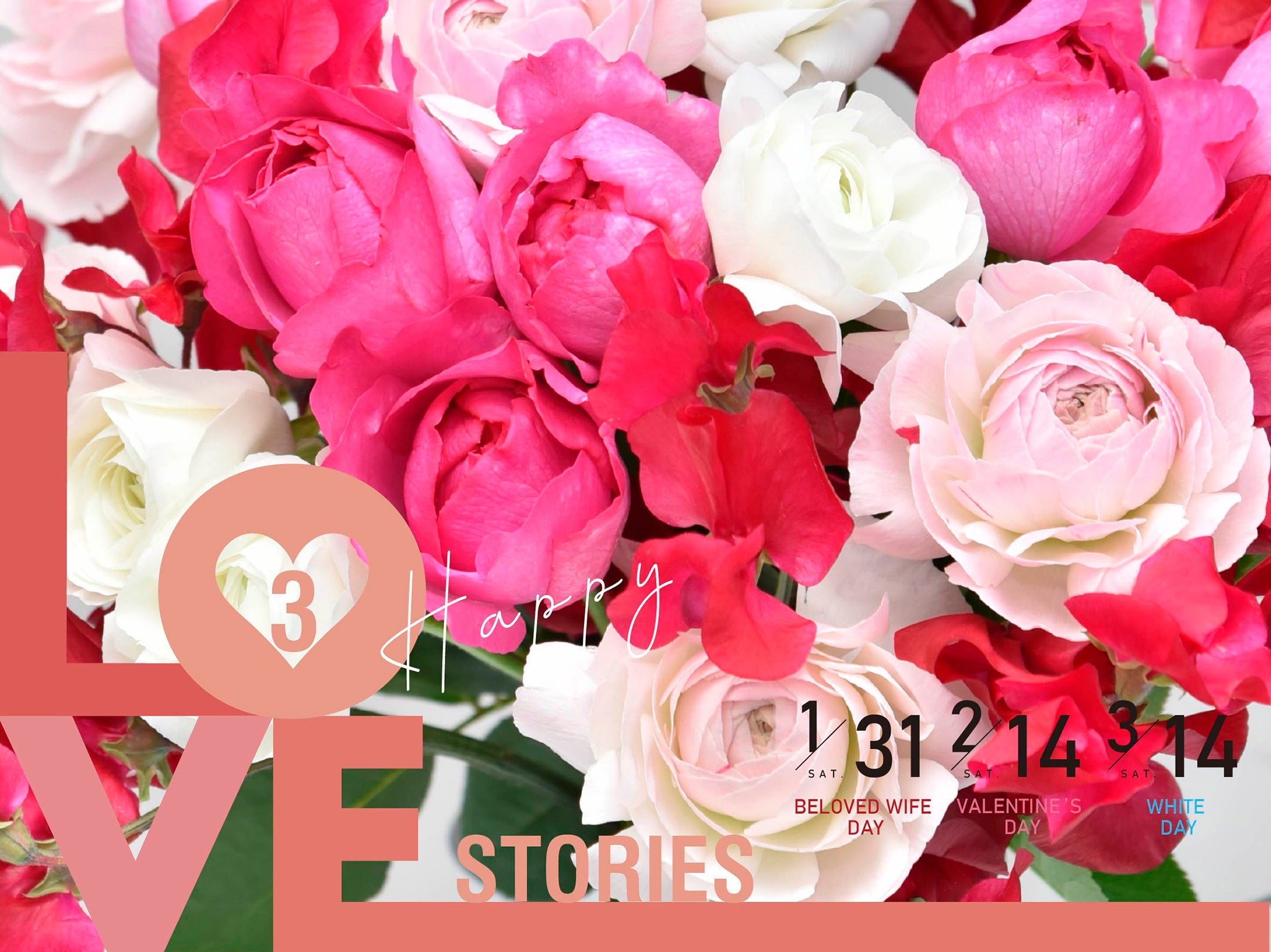 1月31日(土)の愛妻の日、2月14日(土)のバレンタインデー、3月14日(土)のホワイトデーの3つの記念日を「3 LOVE STORIES」として提案し、大切な人へ花を贈る文化を広げるキャンペーンです。