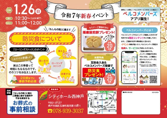 セミナー参加者には、先着20名様限定で播磨屋煎餅をプレゼント。また、来館された方で互助会登録および「ベルコメンバーズ」アプリをダウンロードされた方には、防災食セットを贈呈します。