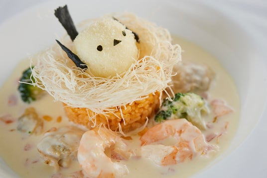 シーフードのア・ラ・クレーム   シマエナガの巣ごもりに見立ててシマエナガの巣に見立てたカダイフ(小麦粉原料の細麺状の生地)が印象的な一品。