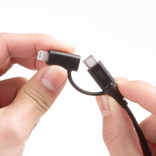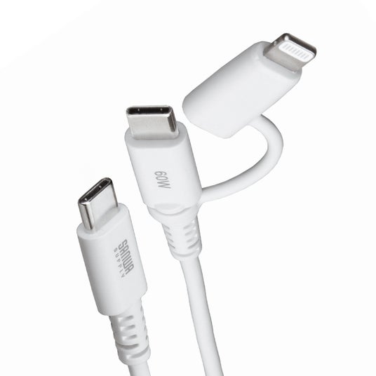 USB2.0 Type-CケーブルにLightning変換アダプタが付属している2in1設計です。 これ1本で、Lightningポート・Type-Cポート搭載機器に接続し、充電・データ通信が可能です。