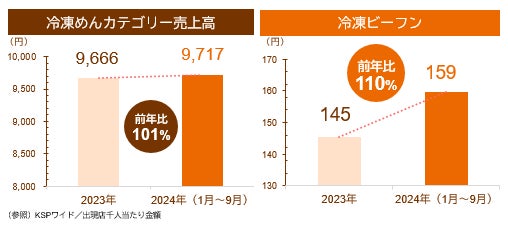 1.冷凍ビーフンは伸長中コロナ禍以降、冷凍食品市場は拡大しており、冷凍めんカテゴリーも同様に伸長しています。2024年は前年比101%でしたが、冷凍ビーフンは前年比110%と市場以上に販売を拡大しています。