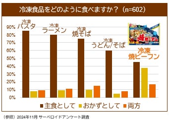 2.冷凍ビーフンは二刀流冷凍めんの多くは、主に主食として利用されているのに対し、冷凍ビーフンは主食として利用が約45%、おかずとして利用が約40%、両方利用が約20%と、他とは違う利用をされています。これは、冷凍ビーフンが野菜や肉などの具材がパスタや焼きそばよりも多いことで、おかずとして夕食の副菜に使われることが多いためです。