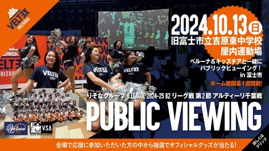 ベルテックス静岡は富士市との協働で10月13日(日)に開催される、りそなグループ B.LEAGUE 2024-25 SEASON 第2節 アルティーリ千葉戦のパブリックビューイング開催いたします。