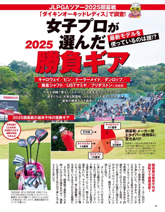 注目特集は「女子プロの勝負ギア2025」 。男子プロよりひと足早く、日本では女子ツアーが開幕! そこで彼女たちが今年の相棒として選んだクラブは? ボールは? ツアー会場で見つけた最新情報とともに紹介!