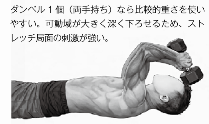 ダンベル 1 個(両手持ち)なら比較的重さを使いやすい。可動域が大きく深く下ろせるため、ストレッチ局面の刺激が強い。