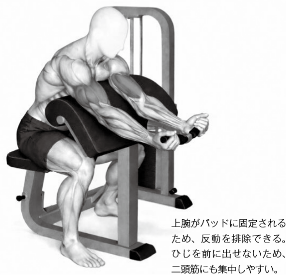上腕がパッドに固定されるため、反動を排除できる。ひじを前に出せないため、二頭筋にも集中しやすい。