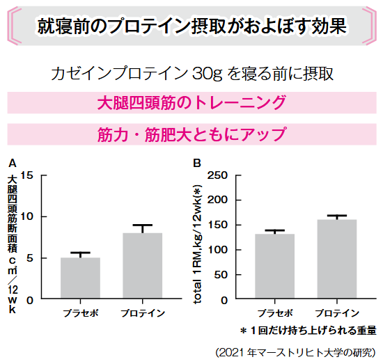 2015年に発表されたマーストリヒト大学の研究では、就寝前にカゼインプロテインを30g摂取したときの筋肥大と筋力の変化を調べた結果、筋力増強、筋肥大ともに就寝前のプロテイン摂取群で有意に向上がみられました。30gという通常よりも多いプロテインを摂取することで、腸内の消化活動が低下する就寝中でも筋タンパク質の合成を促進させることができたというわけです。