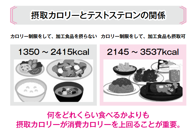 カロリー制限によるテストステロンレベルの違いを調査した研究が、2010年にワシントン大学から発表されました。研究方法としては、対象を左図のようなカロリー制限したふたつの群に分け、どちらの群も摂取カロリーより消費カロリーのほうが高くなるように設定し、加工食品の有無や摂取カロリーの量によるテストステロンの変化を分析したものです。7年間の追跡調査の結果、どちらの群もテストステロンレベルが31%減少し、カロリー制限をするとテストステロンレベルは減少することがわかりました。
