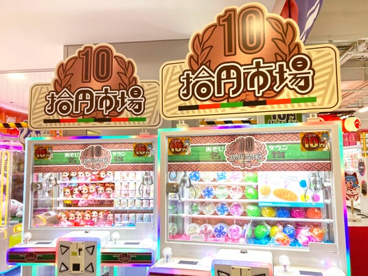 ■10円で遊べるゲームゾーン『拾円市場(じゅうえんいちば)』をチェック!10円で遊べるクレーンゲームコーナー「拾円市場」で、掘り出し物が見つかるかも?!お子様と一緒に10円クレーンゲーム体験はいかがでしょう?!(※写真はサープラ静岡あそびタウン)