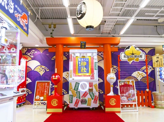 ■世界一応援してくれる?!『おみくじ神社』で運試し!拍手ロボットがお客様の開運を応援!!入口を入るとそこはお祭りの世界感。祭りばやしが流れる駄菓子参道の先には、拍手ロボットを携えた「おみくじ神社」がお客様の開運を応援します。 (※写真はサープラ静岡あそびタウン)