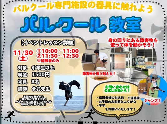 株式会社おさるの森で運営している「パルクールクラブ」が、11月30日(土)に「パルクール教室」を開催いたします。