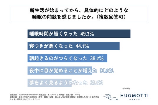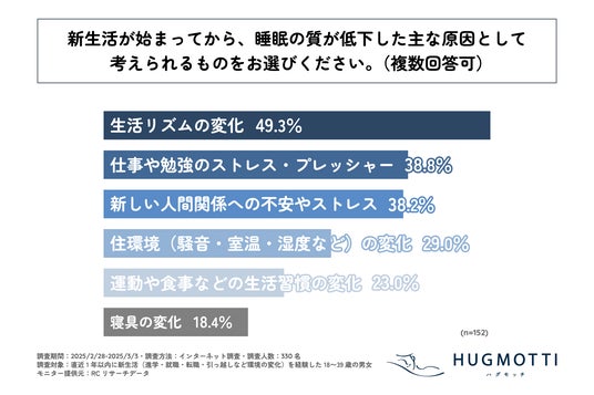 春は、多くの人にとって新生活が始まる季節です。進学や就職、転職、引っ越しなど、環境の変化に直面する人が増える時期でもあります。こうした新たなスタートは期待や希望に満ちたものですが、その一方で生活リズムの変化や新しい人間関係、慣れない環境がストレスとなり、心身に負担を与えることも少なくありません。特に睡眠の質は、こうした変化の影響を受けやすいと考えられます。新しい住環境での寝具の違いや、仕事・学業のプレッシャーによる精神的な緊張は、寝つきの悪さや夜中の中途覚醒を引き起こし、結果的に日中のパフォーマンス低下にもつながる可能性があります。では、実際に新生活を迎える人々は、どのような要因で睡眠の質が低下していると感じているのでしょうか。 また、その改善に向けてどのような対策を考えているのでしょうか。そこで今回「ハグモッチ」は、直近1年以内に新生活(進学・就職・転職・引っ越しなど環境の変化)を経験した18~39歳の男女を対象に、「新生活と睡眠の質」に関する実態調査を実施しました。
