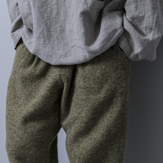ウエストが一周ゴム+コードで固定、裾リブもあるスポーティなデザインのイージーパンツ。ウール素材が主役となることで、上品なニットパンツのように、洒落着にミックスしたい一着です。