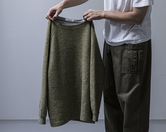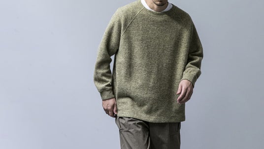 2024年11月8日(金)、国内生地メーカーと協業し、ウールとコットンを組み合わせたクォーターゲージファブリックを別注生産し、ラグランスリーブプルオーバーとイージーパンツの2型をご用意いたしました。