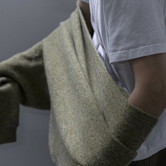 表(=ウールセーターらしい表情)、と裏(肌触りの良いコットン)で別々の糸、編み組織を構成したクォーターゲージファブリックをオーダー。表には、ミックス感のある色味と自然な風合いのウールを、裏には、肌に触れることを考慮してコットンのハイゲージ編成を。二層構造の編み地を、ナイロン糸で繋ぎ合わせています。