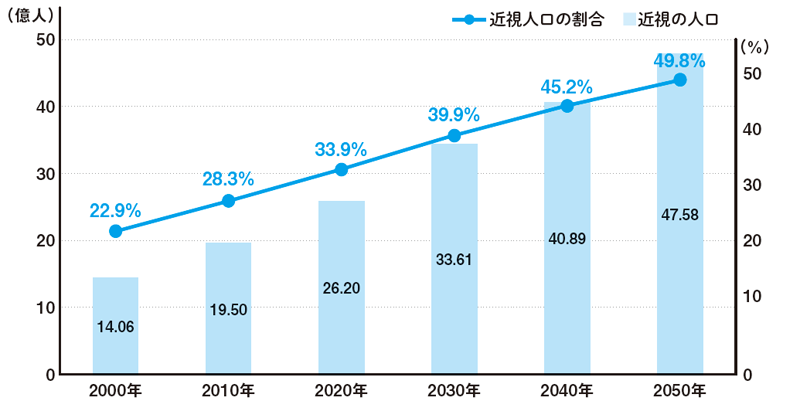 WHO(世界保健機関)は2050年には世界人口の半数が近視になると警鐘を鳴らしており、実際に2020年には近視人口は26.2億人に。近視人口は予想以上に増え続けています。