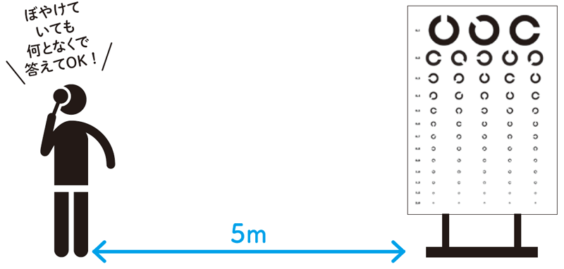 視力は通常、視力計(視力検査指標)から5m離れた位置から計測。はっきり見えていなくても、切れ目がある、色が薄くなっている方向を答える。