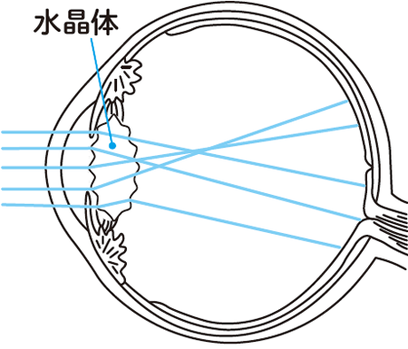 ・水晶体の濁りなどで光が均一に曲げられなくなり、光が散乱してしまいピントが合わなくなる。