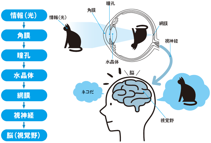 情報(光)は角膜→瞳孔→水晶体を通過して網膜に集まります。カメラに例えると、水晶体がレンズの役割をし、網膜がフィルムの役割。網膜で明るさ、形、色が認識され、その情報が視神経を通って脳に伝わることで映像になります。