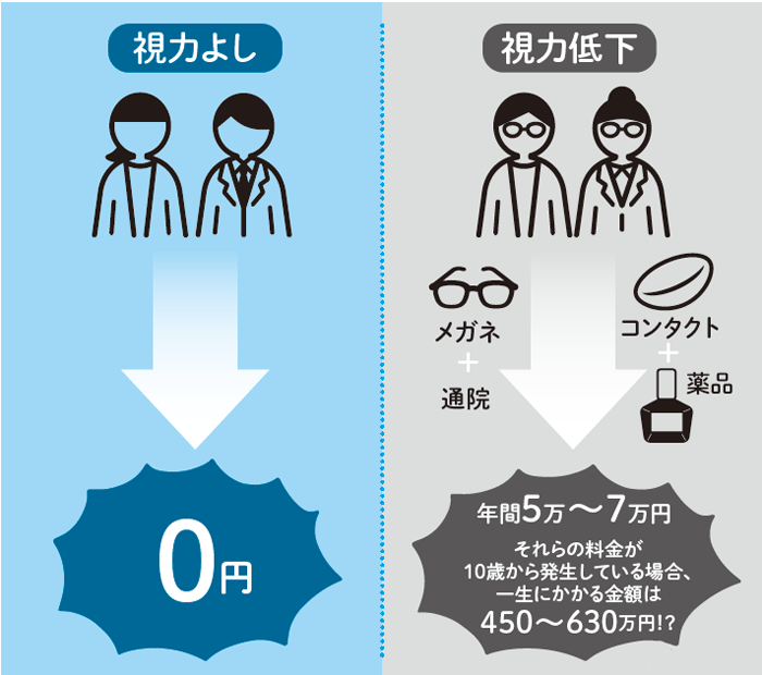 一方、個人的な損失はどうでしょうか。メガネやコンタクト代に加え、薬品代、眼科への通院代も含めると、年間5万~7万円程度の損失になると考えられます。人生100年とすると、10歳から視力が下がってメガネやコンタクトを使い始めた場合、一生のうちにかかる費用は、450万~630万円。近視が進んで眼病になれば、この金額はさらに膨らみます。強度近視では緑内障や白内障のリスクが高まりますが、そうなると手術費用も上乗せされます。