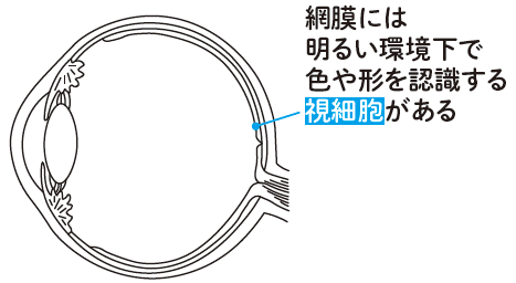 目の中の網膜には光を感じる「視細胞」があり、暗いところと明るいところで使われる視細胞の種類が異なります。視力を決定するのは網膜の中心窩にある「錐体細胞」。この視細胞は明るいときに活性化し、細かいものを見分ける役割があります。